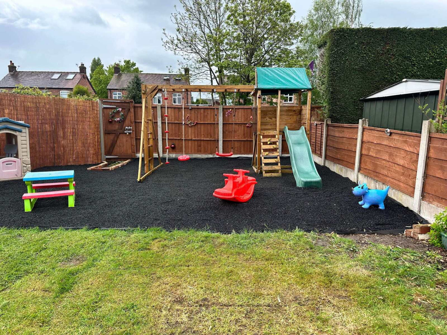 Slight delay with stock on the coloured chippings I ordered, but once sorted delivered quickly and without any bother. Really happy with the quality and colour for the 20mm chippings. A few small wires found while laying it, but the kids have been playing on it barefoot for a few weeks now (not recommended by the supplier, but kids will do what kids will do) and nobody's got a wire in their foot yet 🙂 I used 100mm deep to give a nice soft landing under the monkey bars then 50mm deep elsewhere, giving a nice tidy finish to the kids play area. As a bonus, the cats have shown no interest in using it as a toilet.